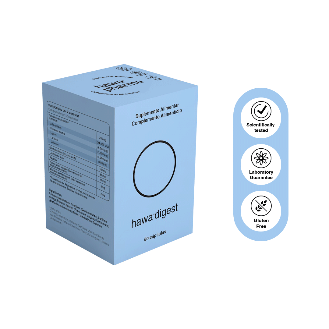 60 Cápsulas - A digestão é o processo que transforma os alimentos em compostos mais pequenos, facilmente assimiláveis ou degradáveis. Durante a decomposição podem surgir algumas dificuldades metabólicas, que originam digestões difíceis, levando a sintomas desagradáveis. Hawa digest apresenta-se como um suplemento de apoio na melhora do desconforto digestivo. Tem na sua composição um complexo de Enzimas digestivas, Fitoterapia de uso tradicional transmitido através de gerações e Óleos essenciais microencapsulados que elevam esta fórmula a um nível excecional. Recomendações: Transtornos digestivos.