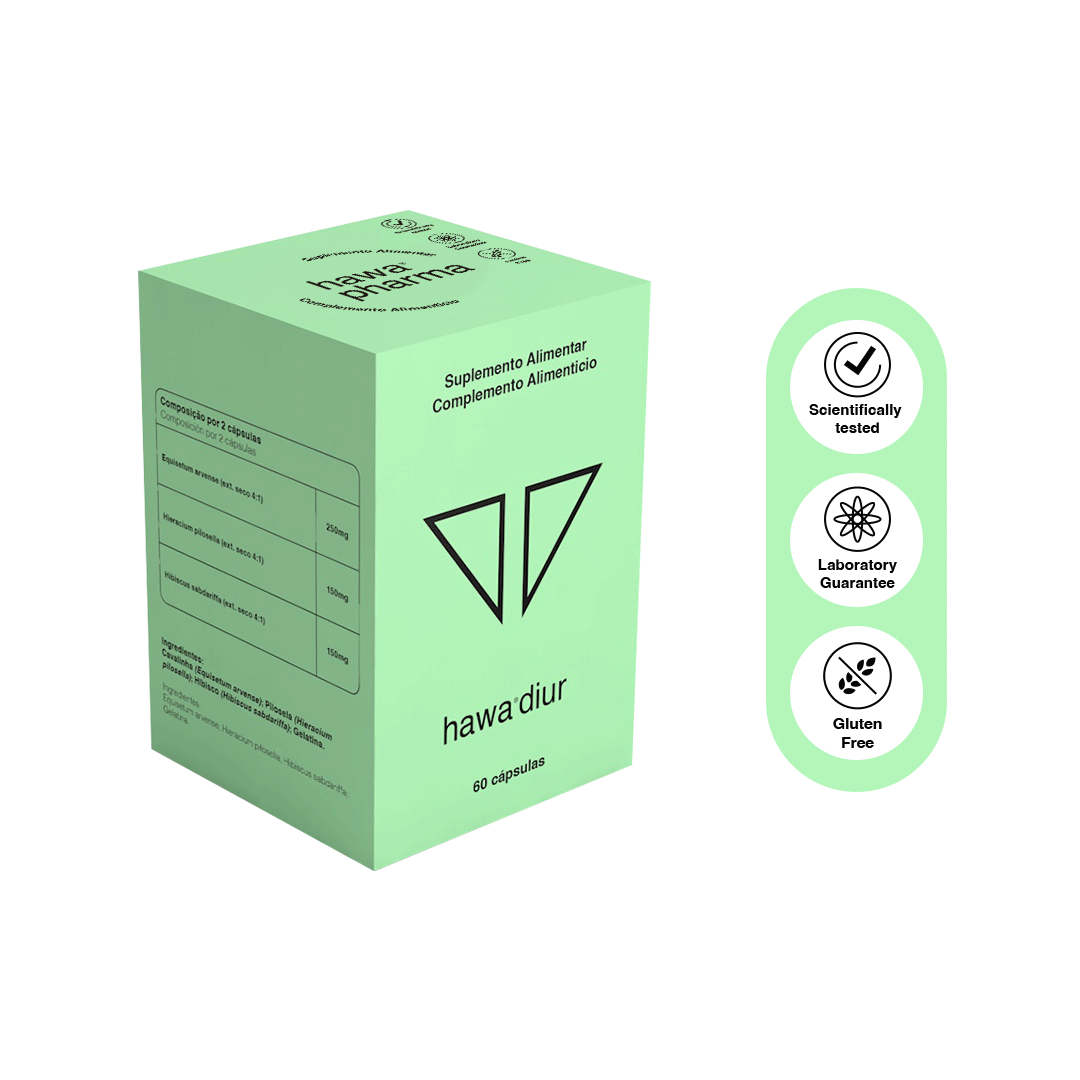 60 Cápsulas - Hawa diur é uma fórmula com Cavalinha, Hisbisco e Pilosela, três plantas que apresentam a melhor sinergia positiva entre si, potenciando a ação total, ou seja, a eliminação de água, não depletando o organismo de minerais e oligoelementos, em particular o potássio e o magnésio. Em fitoterapia estas plantas são apelidadas de aquaréticas. Recomendações: Aquarético, remineralizante, eliminador de toxinas.