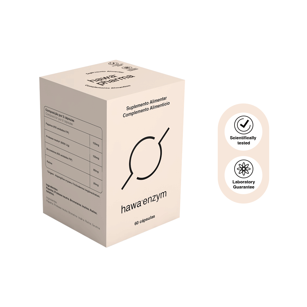 60 Cápsulas - Na terapia enzimática, as enzimas proteolíticas, cuja função é degradar proteína, são as que têm interesse clínico. Hawa enzym é uma formulação que utiliza enzimas ácido-resistentes e a sua conformação em termos de estrutura protídica terciária tridimensional, permite-lhes resistir à atividade hidrolítica inicial da pepsina gástrica, acabando assim por atravessar o estômago sem degradação estrutural, mantendo consequentemente a sua funcionalidade. Recomendações: Transtornos cardiovasculares, lesões desportivas.