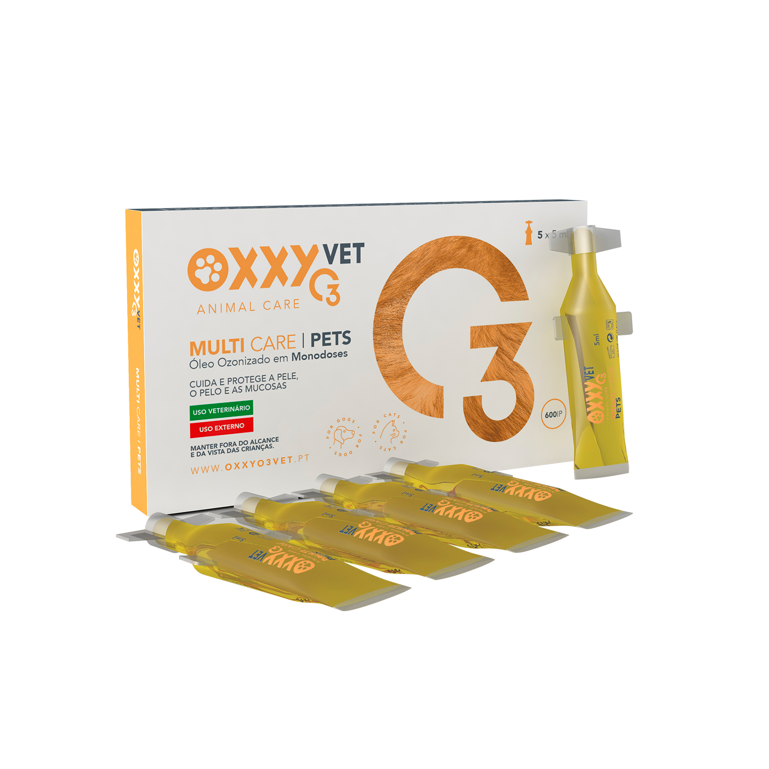 O OxxyO3 VET Multi Care PETS consiste num azeite ozonizado com 600 IP, numa apresentação versátil em monodoses de 5 mL. A forma prática das monodoses permite o uso preciso em zonas localizadas de cuidado da pele e mucosas. O Ozone Multi Care PETS não é tóxico para os animais. Se o animal lamber o produto, não se preocupe, uma vez que, o azeite ozonizado é 100% orgânico, sem conservantes ou estabilizantes, é uma das opções mais naturais disponíveis. O Ozono tem propriedades desinfetantes, calmantes e protetoras do pelo, pele e mucosas. De modo a manter as características do azeite ozonizado, as monodoses, evitam a contaminação e a oxidação do azeite. Caso não utilize a totalidade da monodose, utilize a tampa para fechar até à próxima utilização.